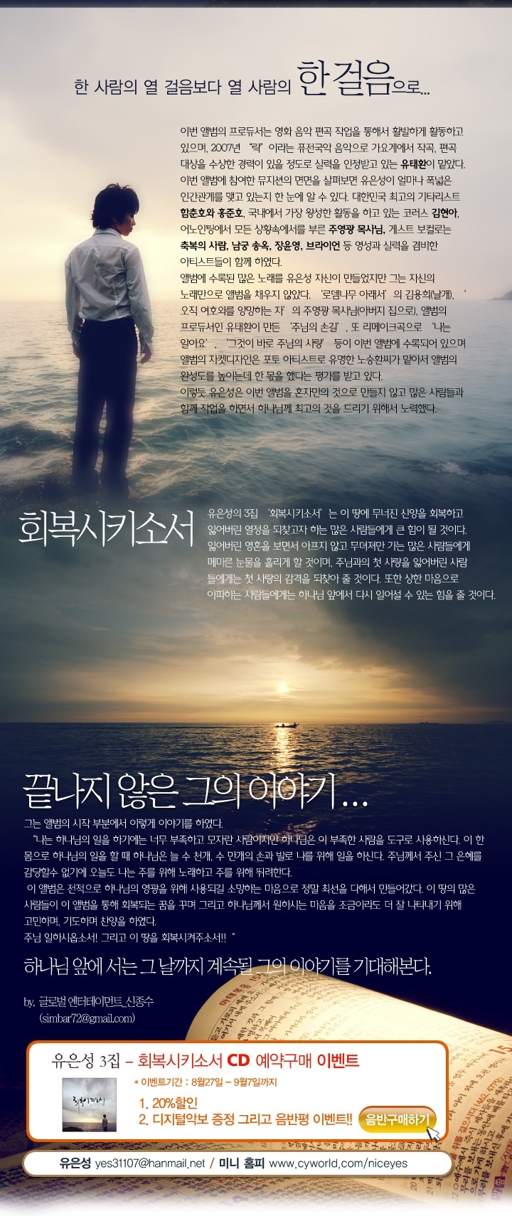회복시키소서 상한 나의마음을 주님 앞에 진실하게 일어설 수 있도록 회복시키소서 지친 나의 모습을 주님 앞에 정결 하게 나아갈 수 있도록. 유은성 you eun sung 회복시키소서 restore me. 이후 목사인 아버지의 영향을 받아 ccm 앨범 '트리니티 하나님 아버지의 마음' '회복시키소서' '난 이렇게 많이 받았는데' '하나만이' 등을 발매했다. 유은성 you eun sung — 회복시키소서 restore me 04:41. 너로 인해 행복하게 될 거야 i will be happy because of you.